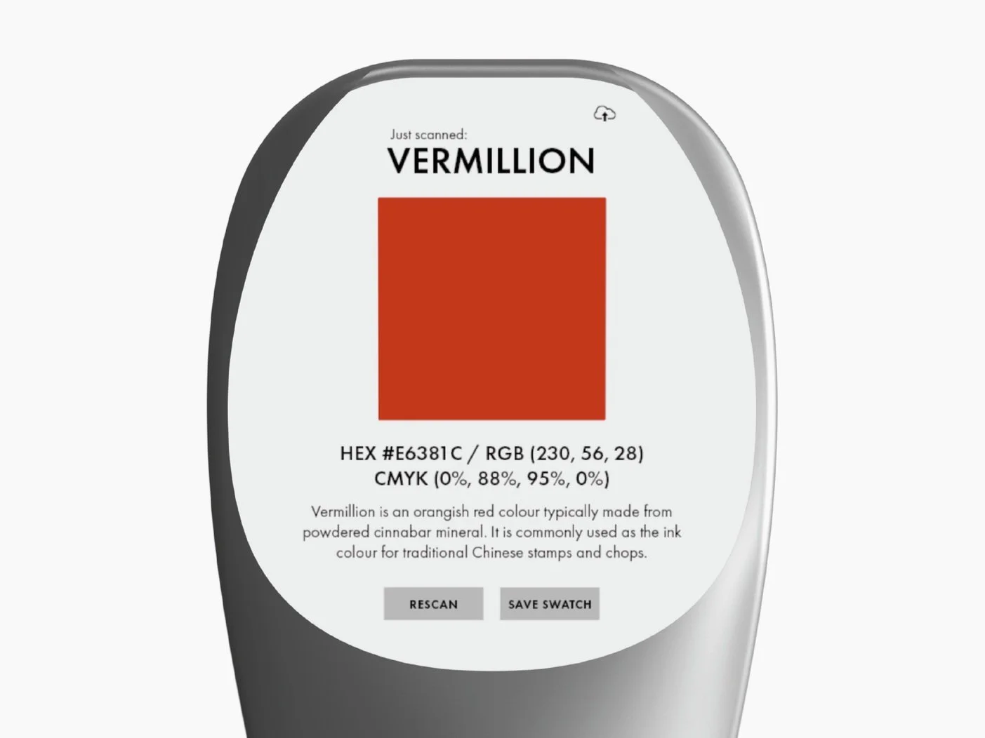 With one click of a button, Chroma Aid can scan a coloured solid surface and then display the RGB, CMYK, and HEX values along with a short description of the newly scanned colour on the user interface.